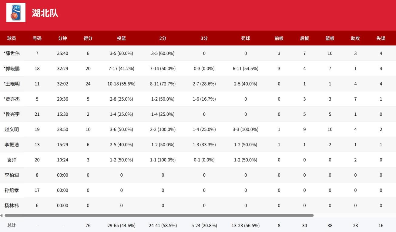 湖北男籃王曉明24分4助,郭曉鵬20分7板,趙義明10分10板;