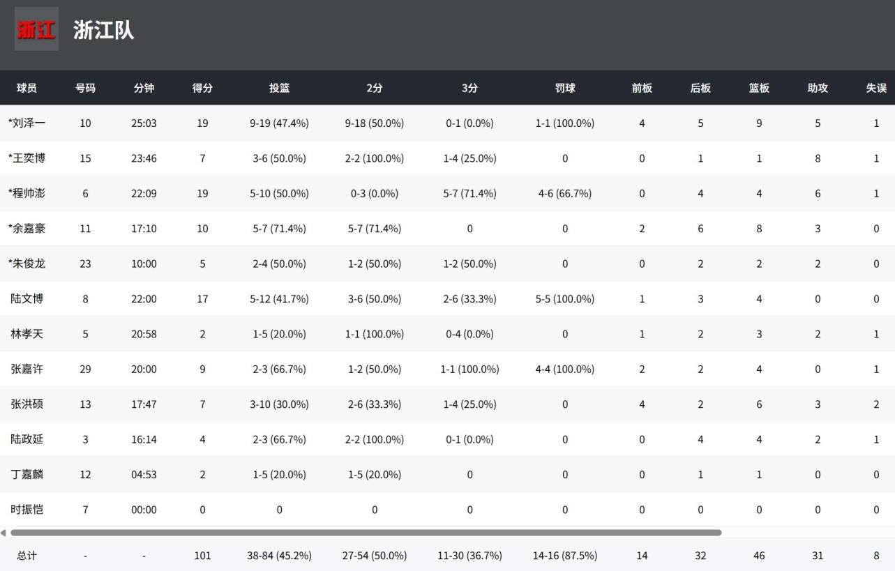 浙江男籃劉澤一19分9板5助,程帥澎19分4板6助,王奕博7分8助。