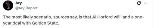 雷速體育7月4日訊 NBA美記Ary剛剛發(fā)推特表示,根據(jù)消息源,霍福德很有可能與勇士簽一年合同。